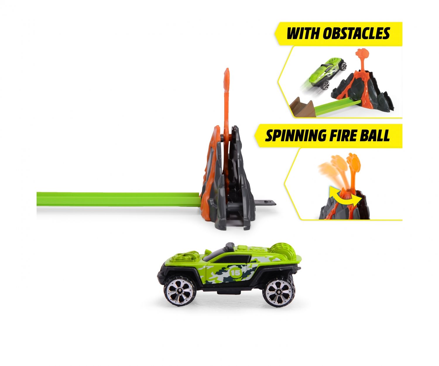 •Feurige Fahrt - Mit Karacho düsen die Autos durch glühende Lava, bezwingen den Feuerball und sausen direkt auf den brodelnden Vulkan zu! Nur die Rampe kann sie retten: Wem gelingt der finale Sprung?