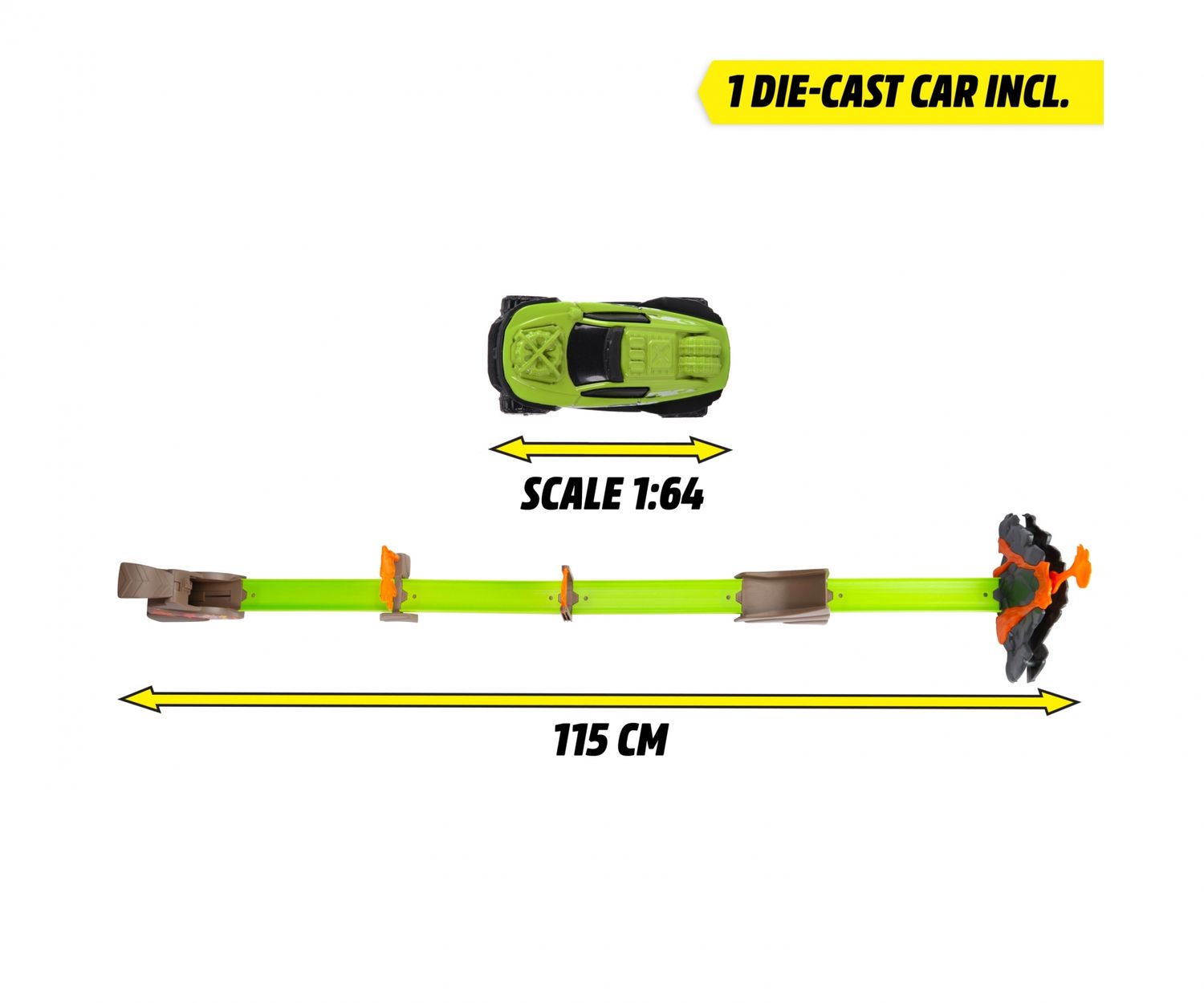 •Katapult-Start - Durch einen gezielten Schlag auf den Launcher wird das mitgelieferte Metallauto auf die 115 cm lange Rennbahn befördert. Nur mit dem richtigen Tempo kann es alle Hindernisse meistern.
