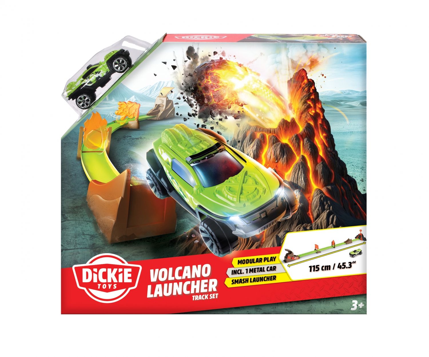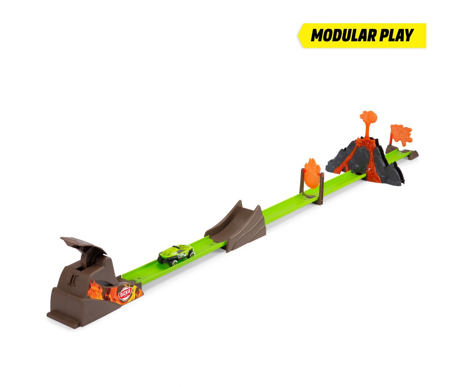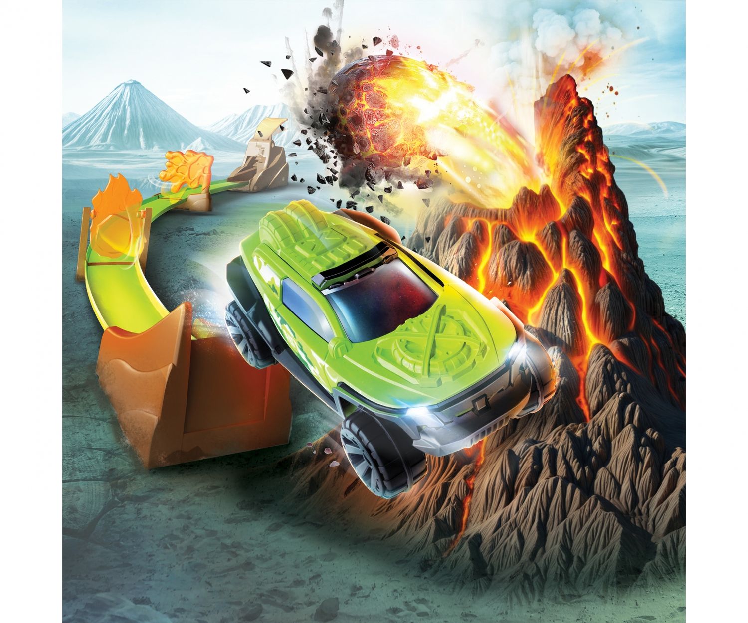 •Showdown am Vulkan – Beim Vorbeifahren löst das Fahrzeug den Vulkanausbruch aus: Spiel-Steine fliegen aus dem Krater und können das Auto vom Kurs abbringen. Oder entkommt der heißen Falle?