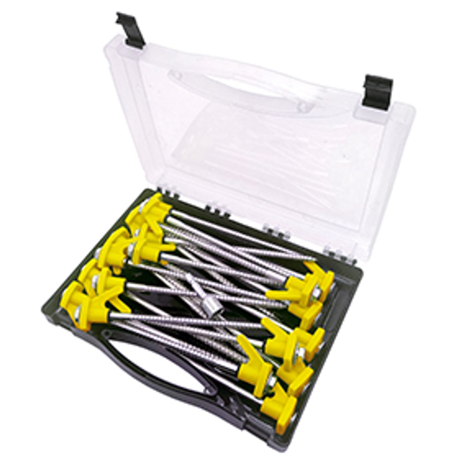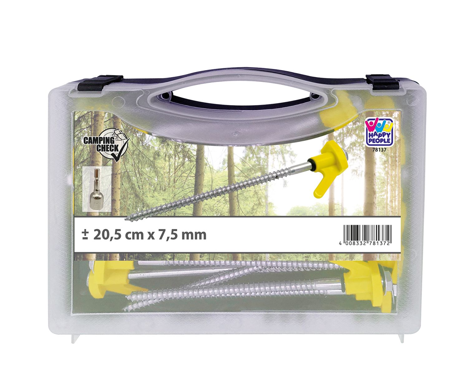 Box mit Schraub-Zeltnägeln ca.25 x 22 x 4,2 cm,bestehend aus:20x Schraub-Zeltnägel,ca. 20,5cm x 7,5mm,1x Adapter,ca. 13mm,Akkuschrauber geeignet