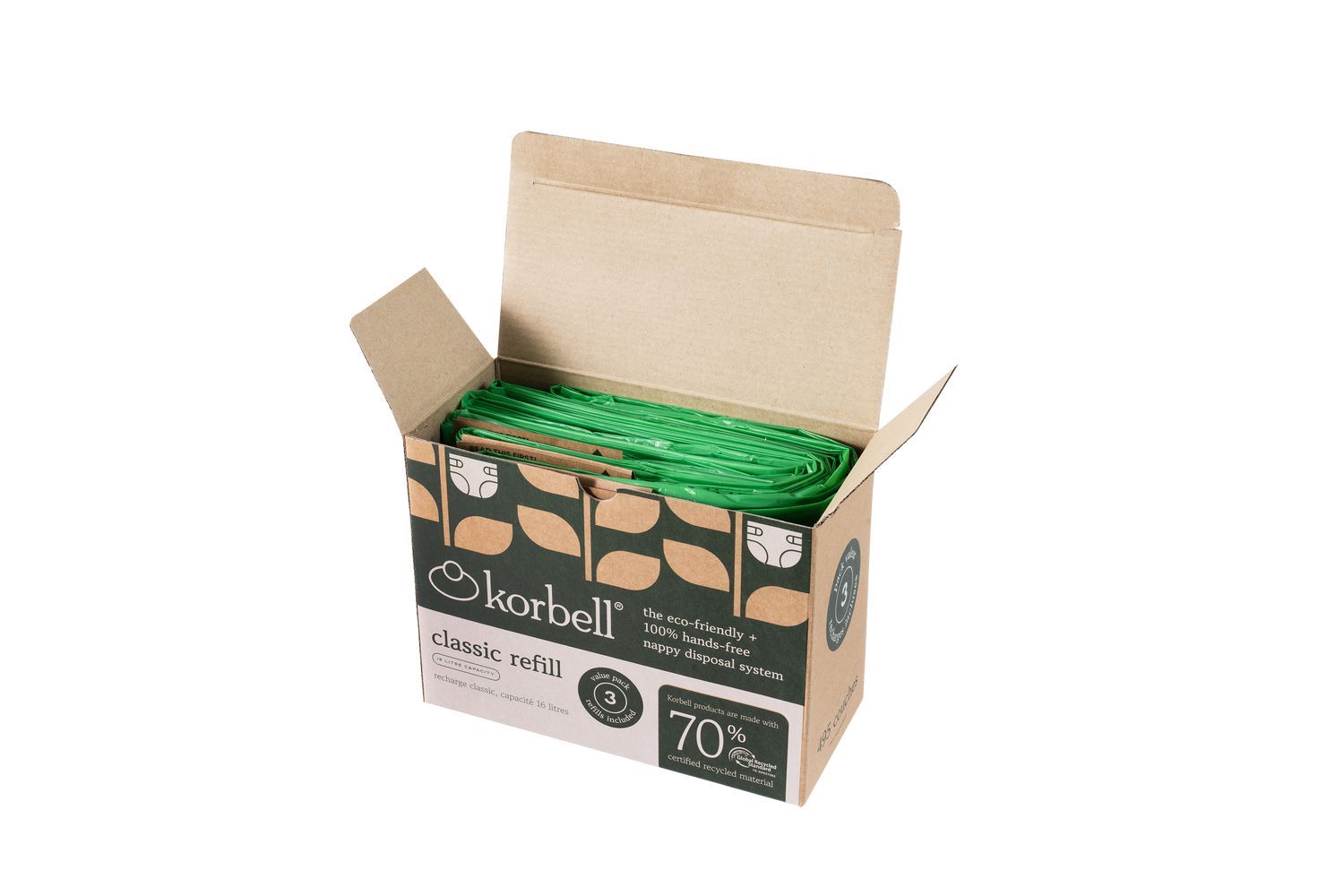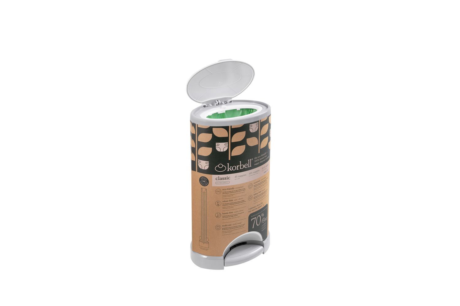 Das Herstellerkonzept hat auch die Umwelt im Blick: Der Korbell Windeleimer wird mit einer biologisch abbaubaren Nachfüllfolie geliefert, sodass die verantwortungsvolle Entsorgung von Windeln ein Kinderspiel wird.