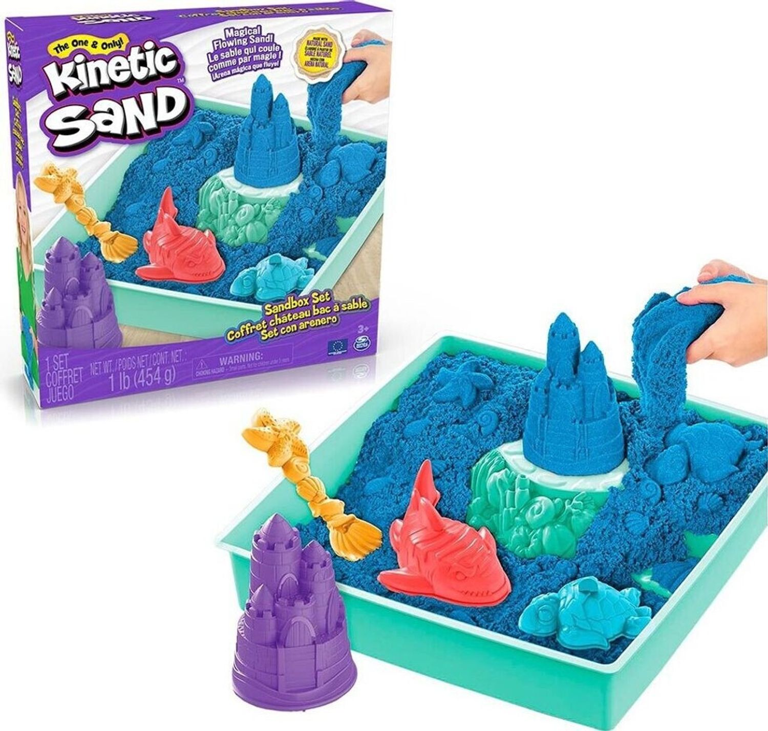 • Komplettset mit Sandbox, blauem Kinetic Sand, Förmchen und Werkzeugen – sofort spielbereit